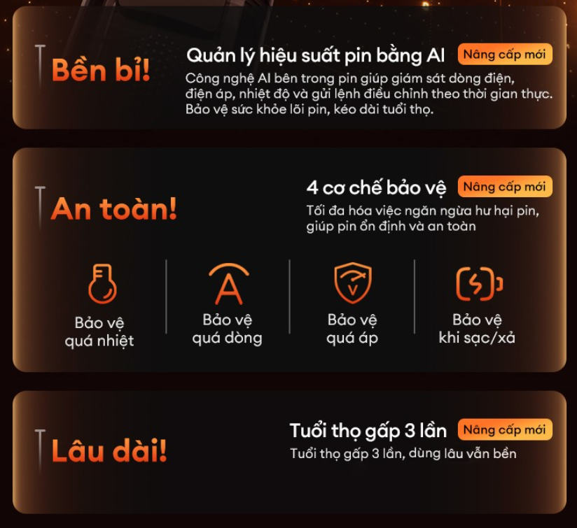 Tích hợp AI quản lý pin và 4 cơ chế bảo vệ (quá nhiệt, quá dòng, quá áp, sạc/xả).