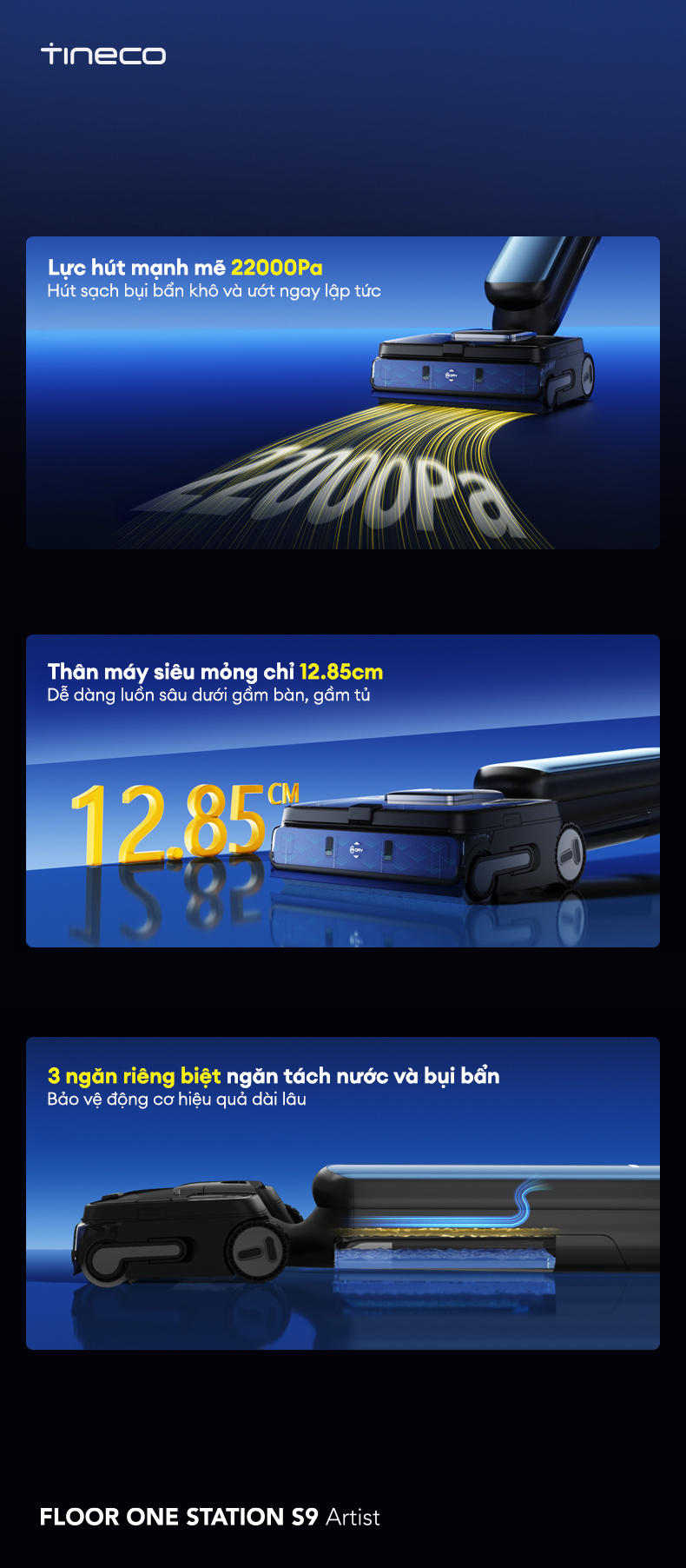 Máy hút bụi lau sàn khô ướt Tineco FLOOR ONE STATION S9 Artist là sự kết hợp hoàn hảo giữa công nghệ, hiệu năng và thiết kế. Với hàng loạt tính năng vượt trội như lực hút 22.000Pa, lau nước nóng, tự động làm sạch và vận hành thông minh, sản phẩm xứng đáng là lựa chọn hàng đầu cho mọi gia đình hiện đại.