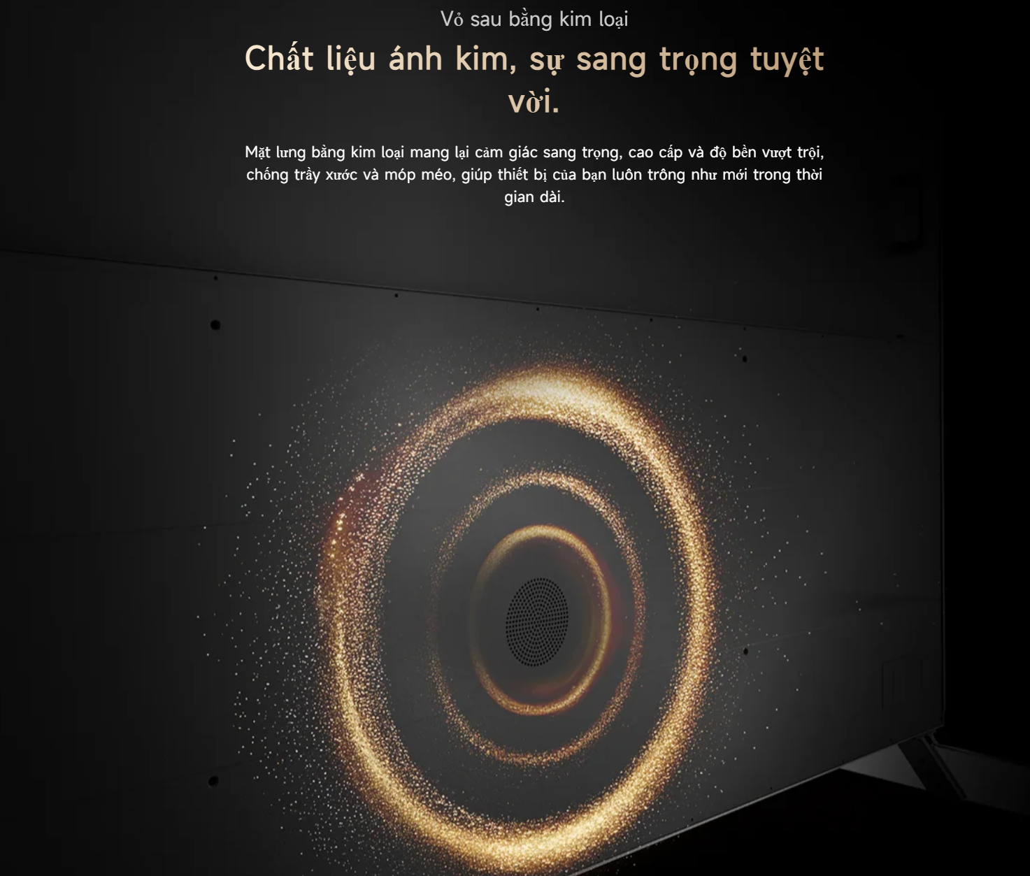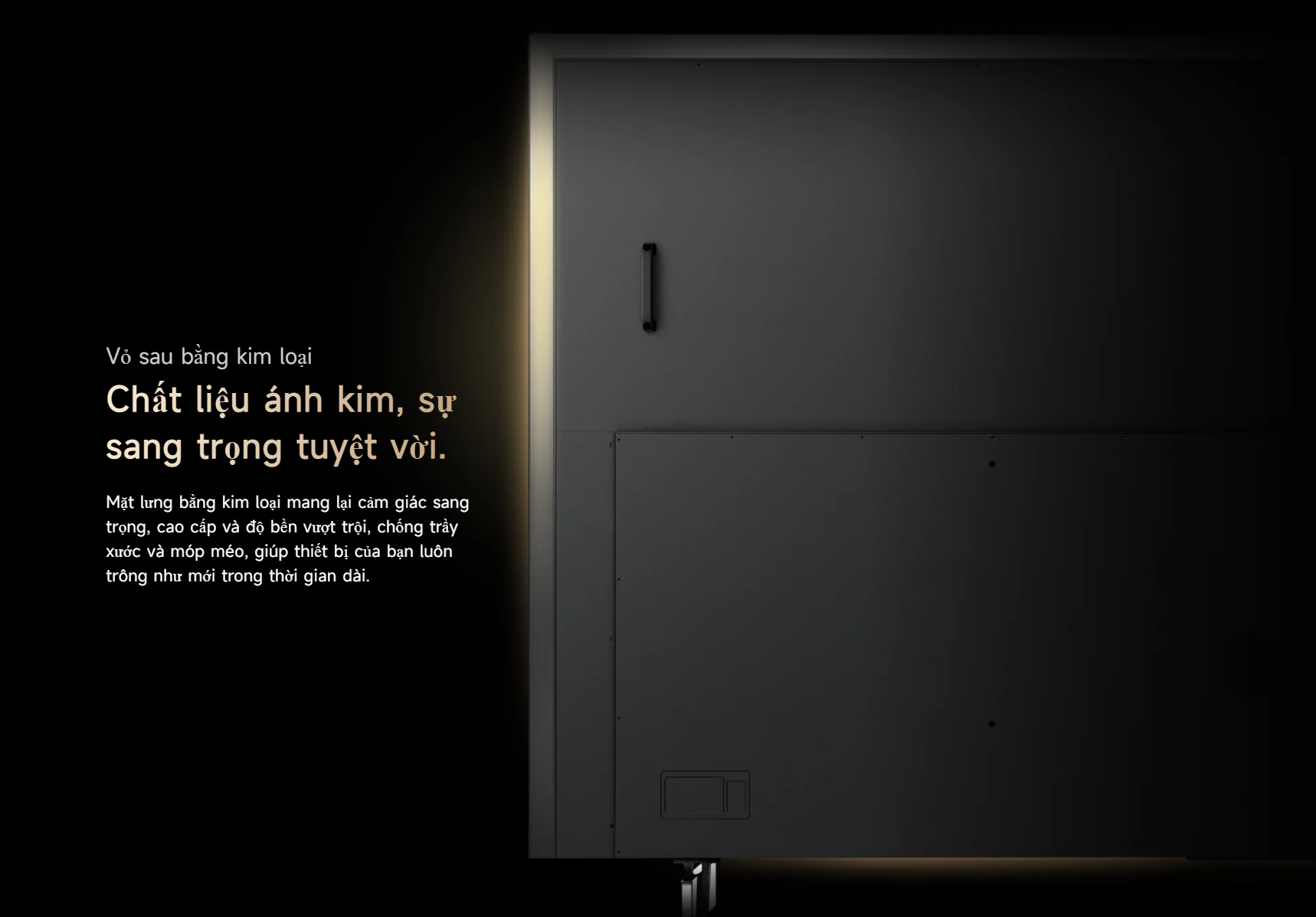 Dreame Q100 100 inch gây ấn tượng mạnh với thiết kế màn hình không viền, mở rộng tối đa không gian hiển thị. Kích thước lớn kết hợp công nghệ Infinite Screen tạo nên trải nghiệm xem toàn cảnh, giúp người dùng đắm chìm hoàn toàn vào nội dung. Phần khung và mặt lưng kim loại mang lại cảm giác sang trọng, chắc chắn và bền bỉ theo thời gian, đồng thời nâng tầm thẩm mỹ cho không gian sống.