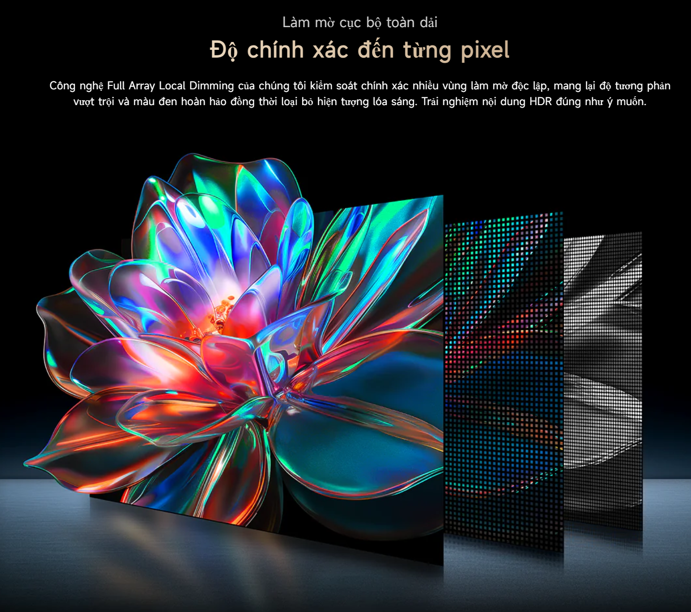 Tivi sử dụng công nghệ làm mờ cục bộ toàn dải với nhiều vùng điều khiển độc lập, giúp kiểm soát ánh sáng chính xác đến từng khu vực. Điều này cải thiện đáng kể độ tương phản, mang lại màu đen sâu hơn và hạn chế hiện tượng hở sáng.