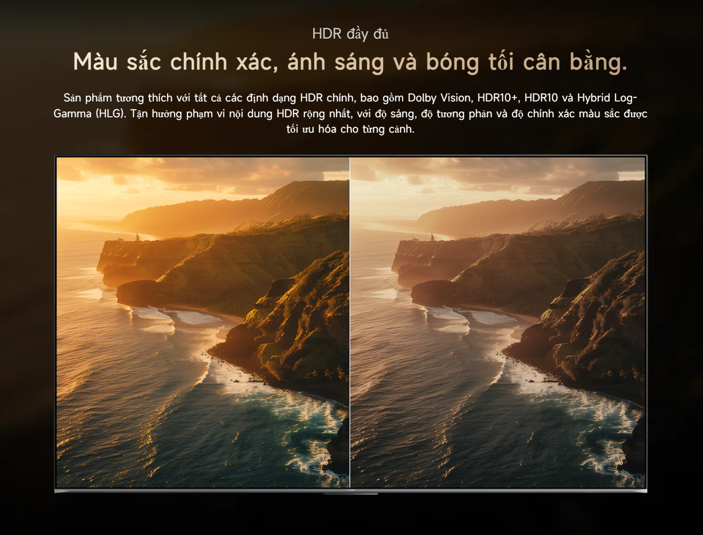 Sản phẩm hỗ trợ các định dạng HDR như Dolby Vision, HDR10+, HDR10 và HLG. Công nghệ này giúp cân bằng ánh sáng, mở rộng dải tương phản và tái tạo chi tiết tốt hơn ở cả vùng sáng và vùng tối. Hình ảnh hiển thị có chiều sâu và chân thực hơn, mang lại trải nghiệm xem phim chất lượng cao.
