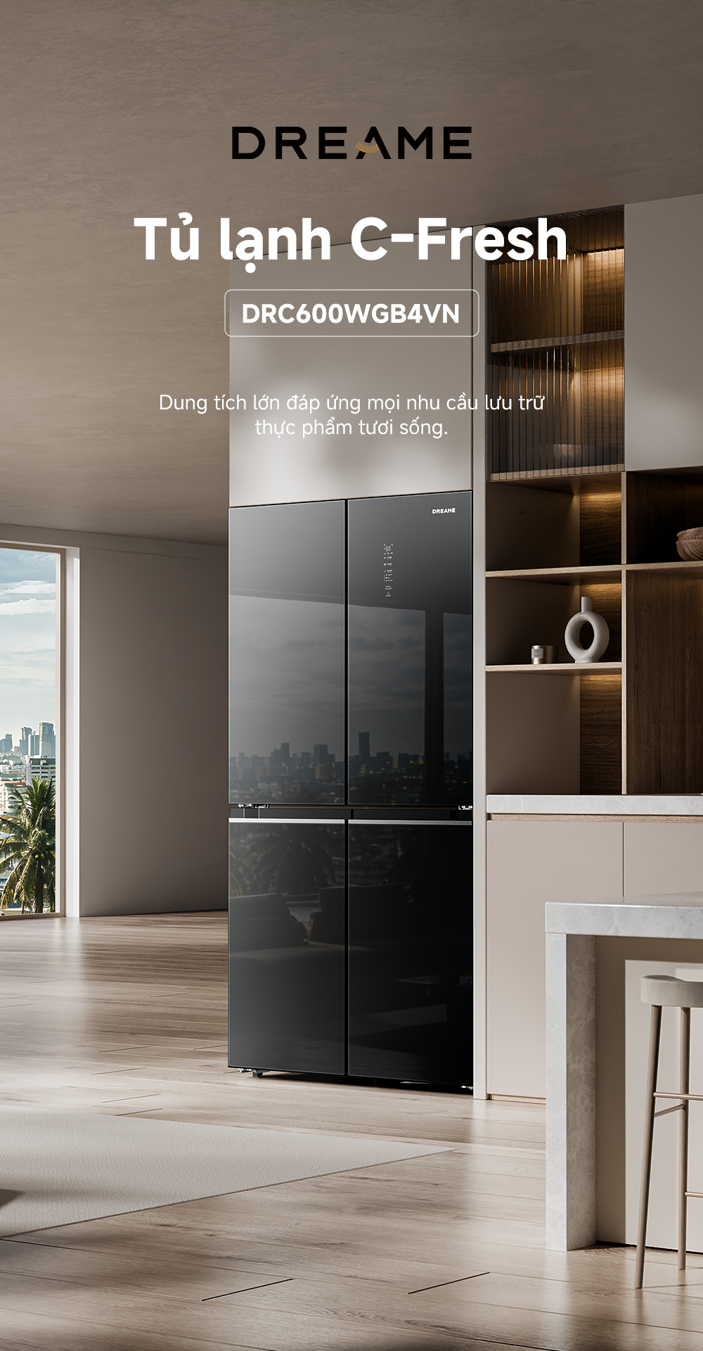 Điểm đặc trưng của tủ lạnh Dreame C-Fresh 600L là khả năng sở hữu dung tích lớn nhưng thân tủ vẫn gọn gàng. Nhờ quá trình tối ưu kỹ thuật, tủ có thể lắp âm tủ bếp hoặc đặt sát tường mà không gây cản trở không gian.