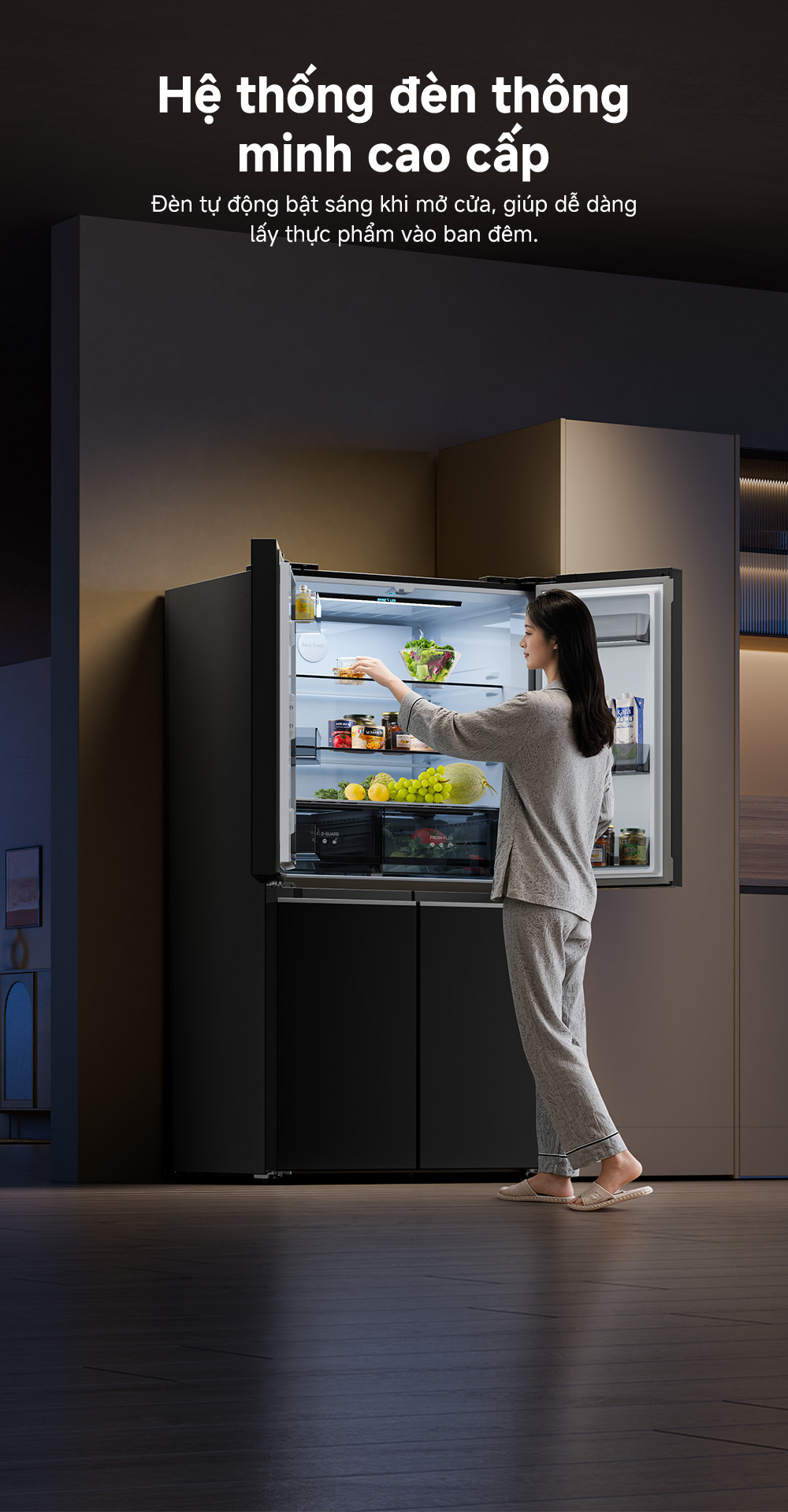 Khoang chứa rộng rãi cho phép người dùng dễ dàng phân loại và sắp xếp thực phẩm như rau củ, trái cây, thịt cá, đồ đông lạnh hay thực phẩm chế biến sẵn mà không lo quá tải. Đây được xem là giải pháp lưu trữ thực phẩm hiện đại và chuyên nghiệp ngay trong gian bếp gia đình.