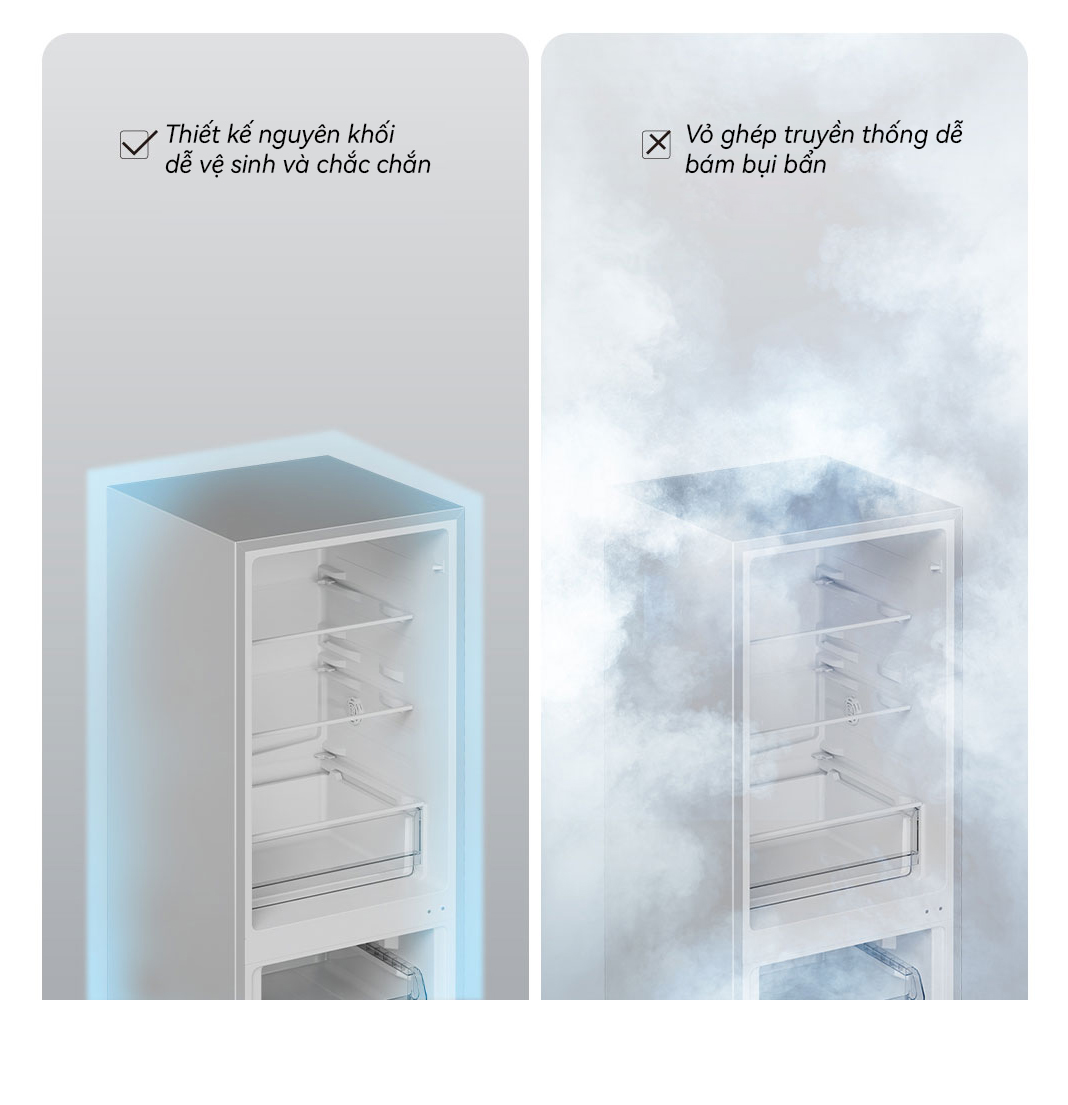 Tủ lạnh Xiaomi 215L sở hữu thiết kế nguyên khối liền mạch, được tạo thành từ một tấm vật liệu đúc nguyên bản, không để lại khe hở. Nhờ đó, hạn chế tối đa việc tích tụ bụi bẩn và vi khuẩn, đồng thời giữ lạnh tốt hơn, giúp tiết kiệm điện năng. So với các thiết kế ghép nối truyền thống, kiểu dáng này không chỉ mang lại vẻ ngoài tinh tế mà còn nâng cao hiệu quả bảo quản thực phẩm trong thời gian dài.