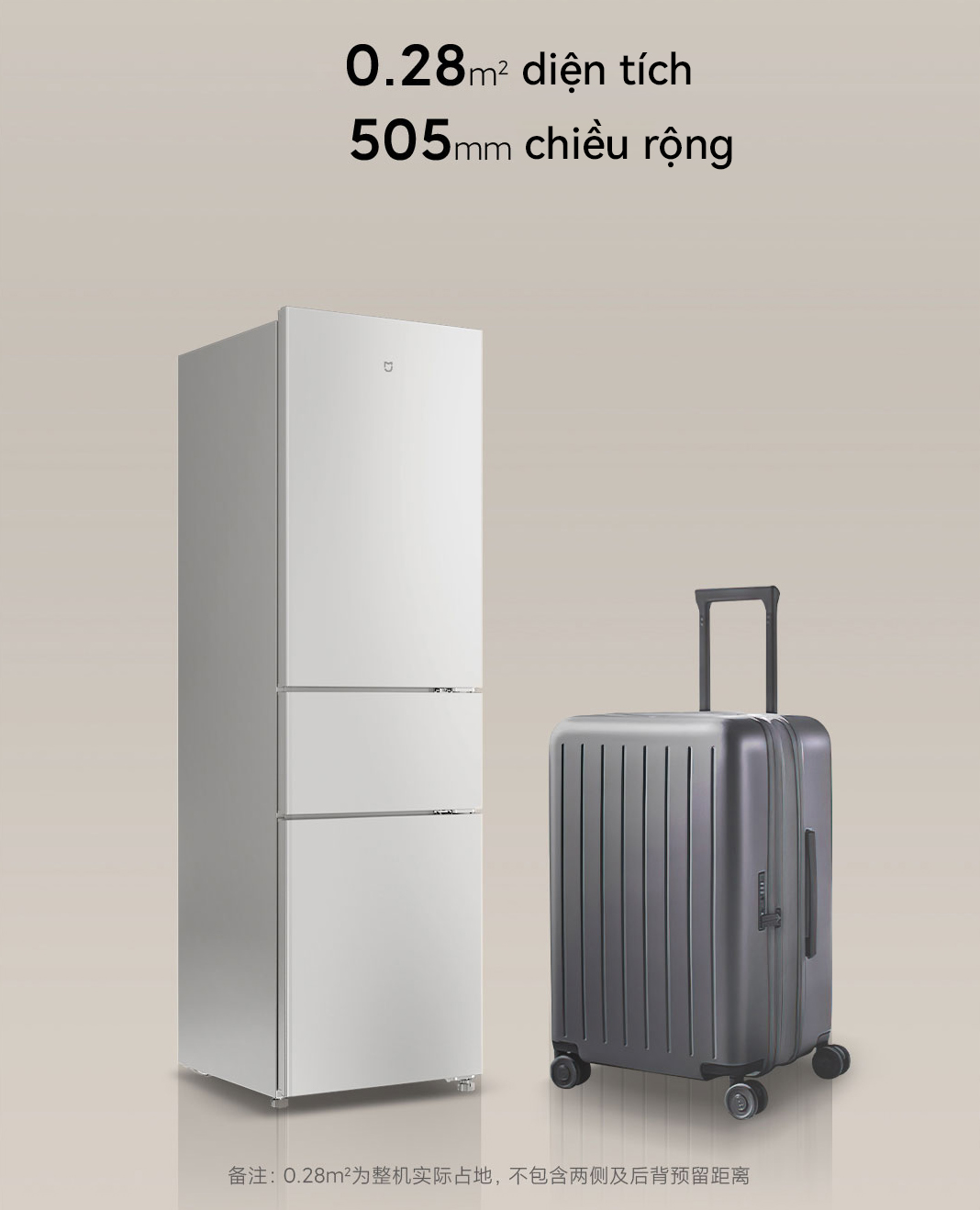 Tủ lạnh Xiaomi 215L sở hữu thiết kế gọn nhẹ, hiện đại, phù hợp hoàn hảo với các không gian sống nhỏ như căn hộ mini hay phòng trọ. Với diện tích chiếm dụng chỉ khoảng 0.28 m² – tương đương kích thước của một chiếc vali – sản phẩm giúp tối ưu hóa không gian mà vẫn đảm bảo đầy đủ công năng. Bên ngoài được hoàn thiện từ chất liệu cao cấp, mang lại vẻ tinh xảo và bền bỉ theo thời gian.