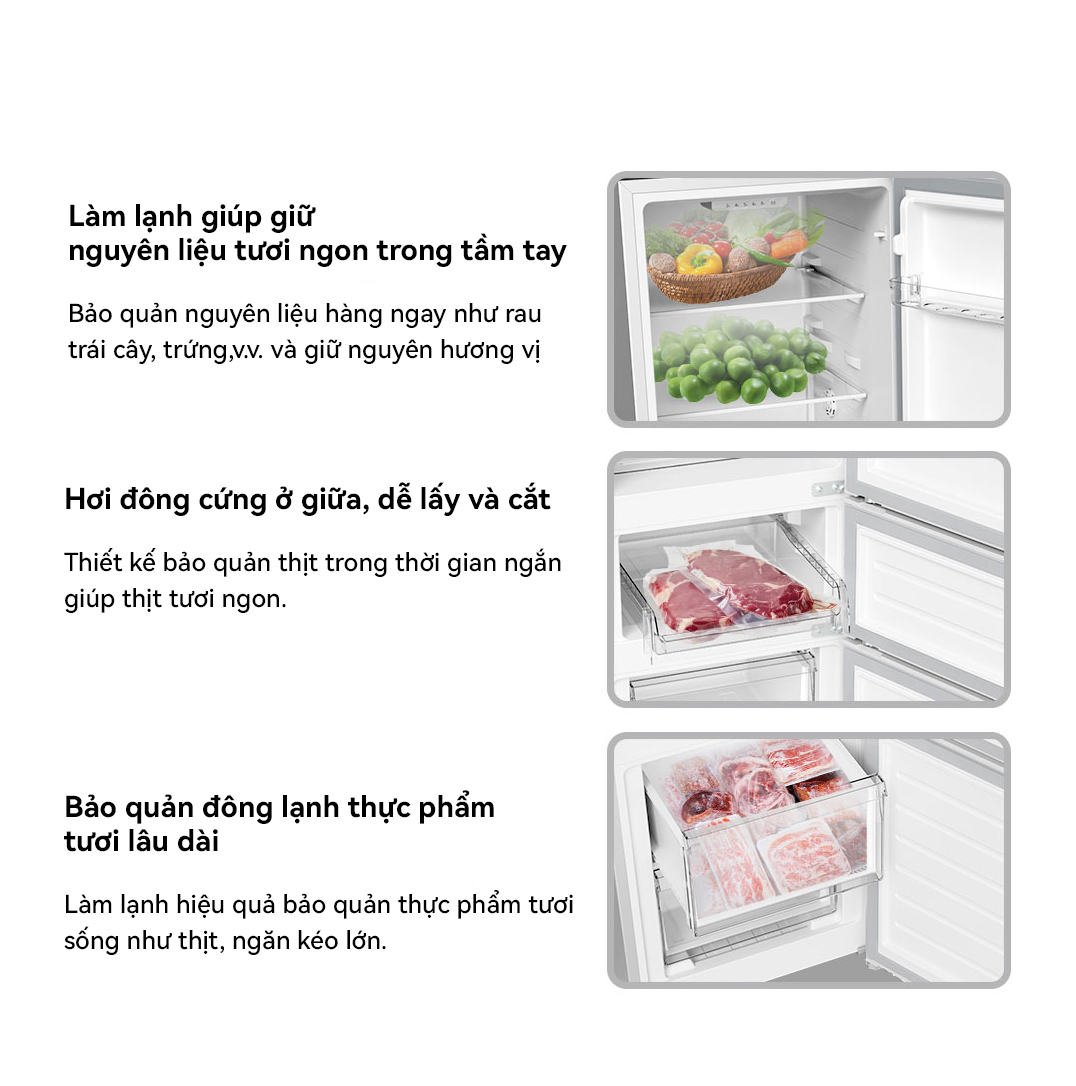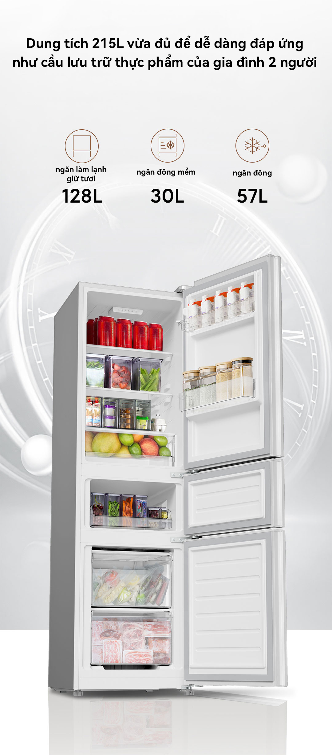 Tủ lạnh Xiaomi 215L được thiết kế với cấu trúc ba ngăn – ba mức nhiệt độ riêng biệt, đáp ứng linh hoạt nhiều nhu cầu bảo quản thực phẩm khác nhau trong gia đình.