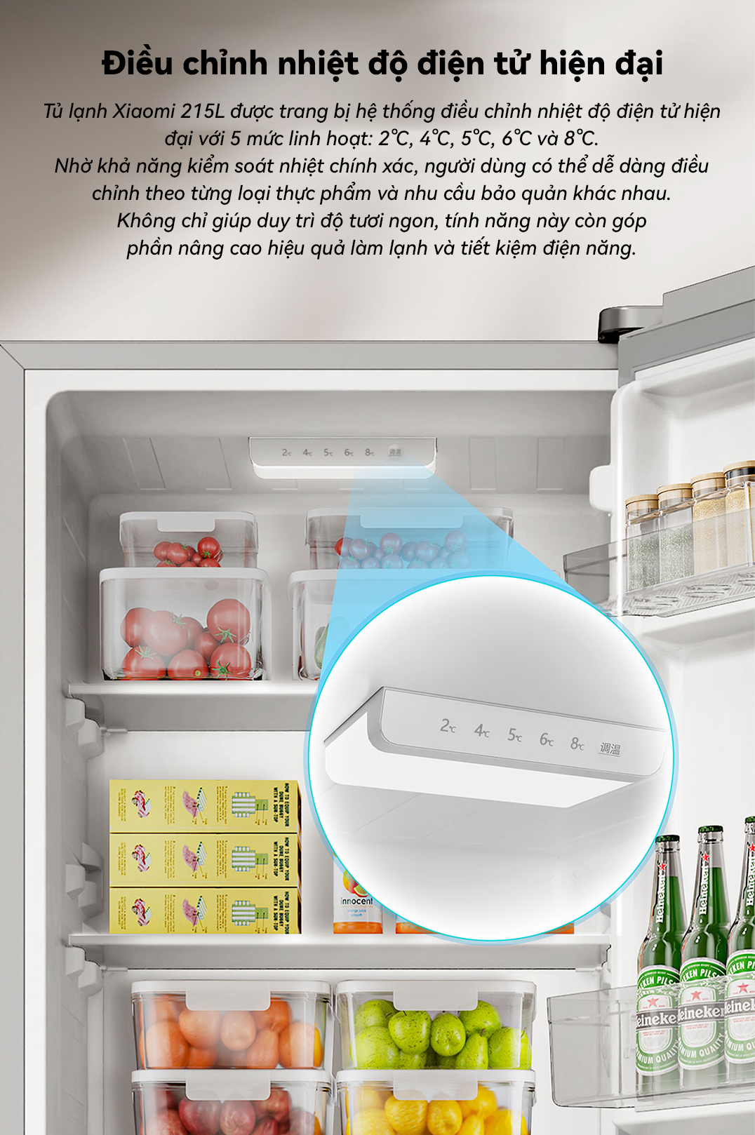 Tủ lạnh Xiaomi 215L được trang bị hệ thống điều chỉnh nhiệt độ điện tử hiện đại với 5 mức linh hoạt: 2°C, 4°C, 5°C, 6°C và 8°C. Nhờ khả năng kiểm soát nhiệt chính xác, người dùng có thể dễ dàng điều chỉnh theo từng loại thực phẩm và nhu cầu bảo quản khác nhau. Không chỉ giúp duy trì độ tươi ngon, tính năng này còn góp phần nâng cao hiệu quả làm lạnh và tiết kiệm điện năng.