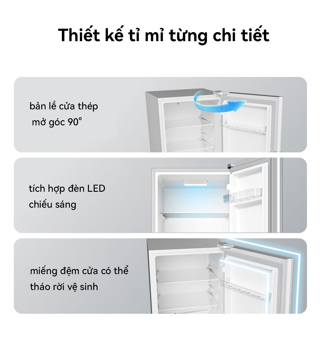 Tủ lạnh Xiaomi 215L được thiết kế tỉ mỉ đến từng chi tiết nhằm nâng cao trải nghiệm sử dụng. Bản lề thép chắc chắn giúp cửa mở linh hoạt đến 90 độ mà không bị vướng, vận hành êm ái và bền bỉ theo thời gian. Hệ thống đèn LED bố trí ở phía trên giúp ánh sáng lan tỏa đều, dễ dàng quan sát thực phẩm bên trong. Ngoài ra, viền cửa có thể tháo rời để vệ sinh, đảm bảo tủ luôn sạch sẽ và an toàn trong quá trình sử dụng lâu dài.
