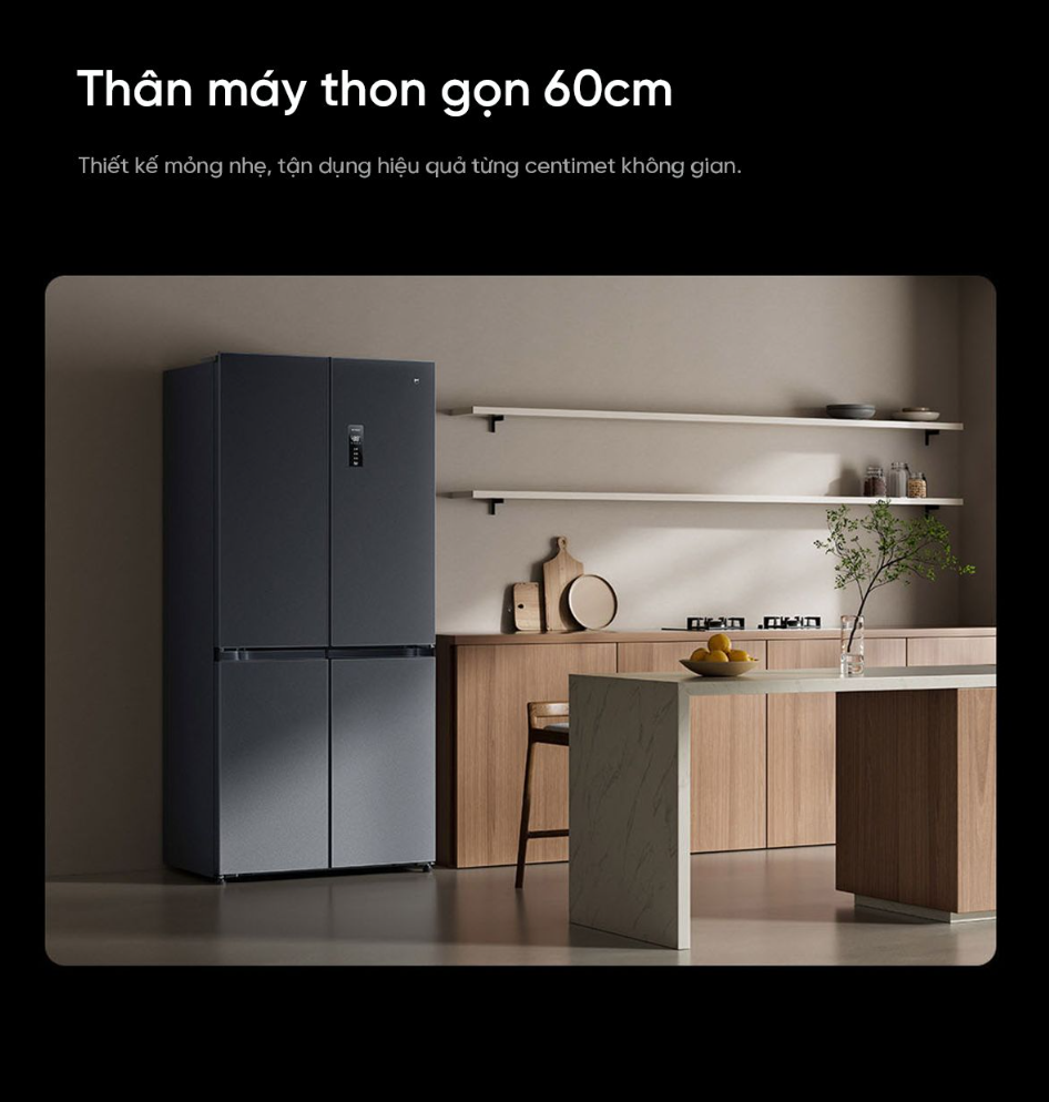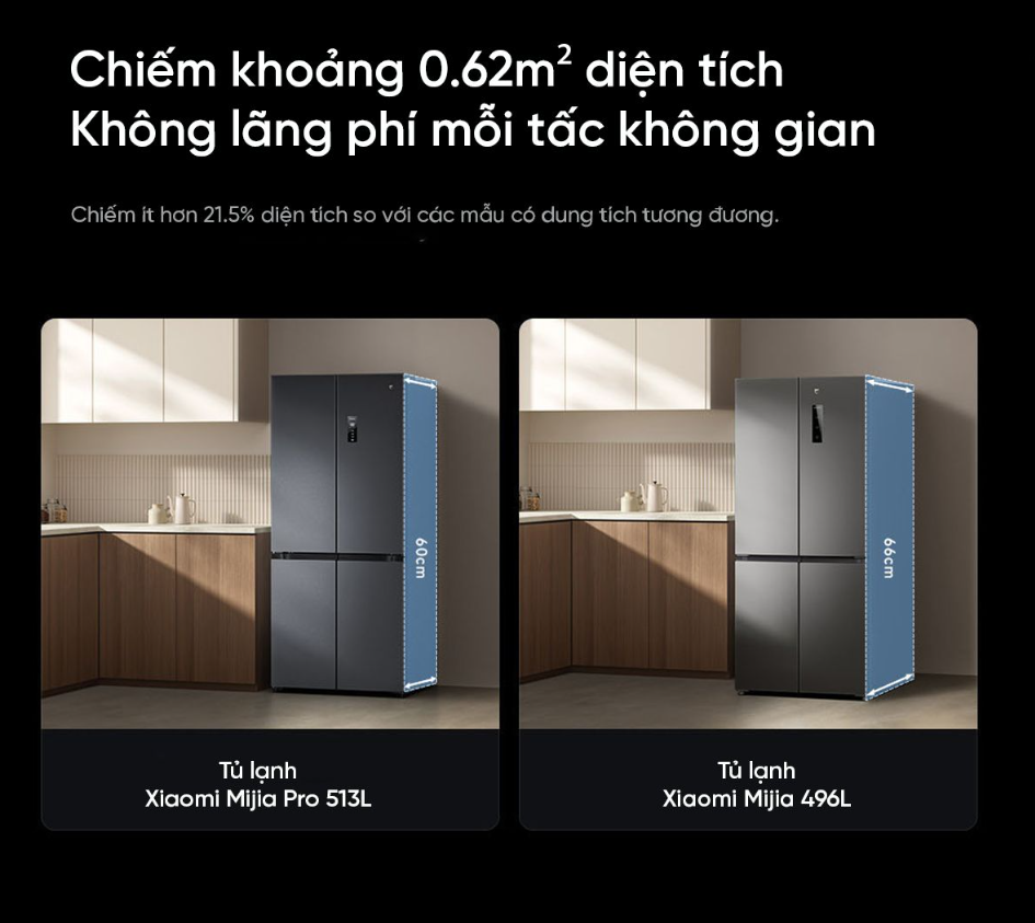 Tủ lạnh Mijia 513L Pro có thân máy siêu mỏng với độ dày chỉ 60 cm, không gây vướng víu. Với diện tích chỉ khoảng 0,62m2, tủ giúp tối ưu hóa không gian phòng bếp, không lãng phí một inch không gian sống. So với tủ lạnh thông thường, sản phẩm này tiết kiệm không gian tới 21,5%, đồng nghĩa với việc bạn có thể lắp đặt tủ trong những khu vực có diện tích hẹp mà vẫn đảm bảo được dung lượng lưu trữ thực phẩm như thường lệ.