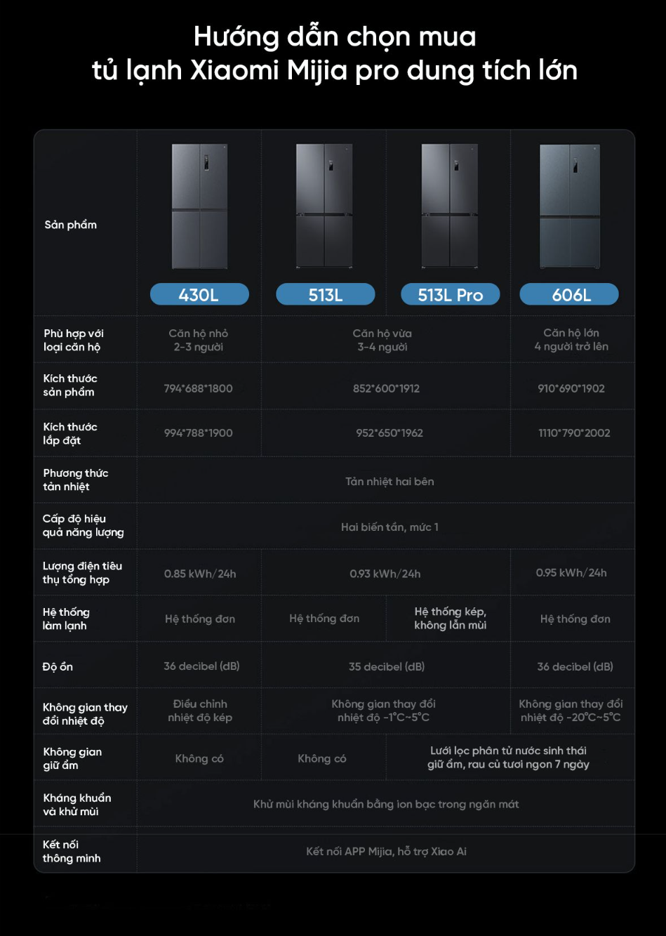 So sánh Tủ lạnh 430L - 513L - 513L Pro - 606L