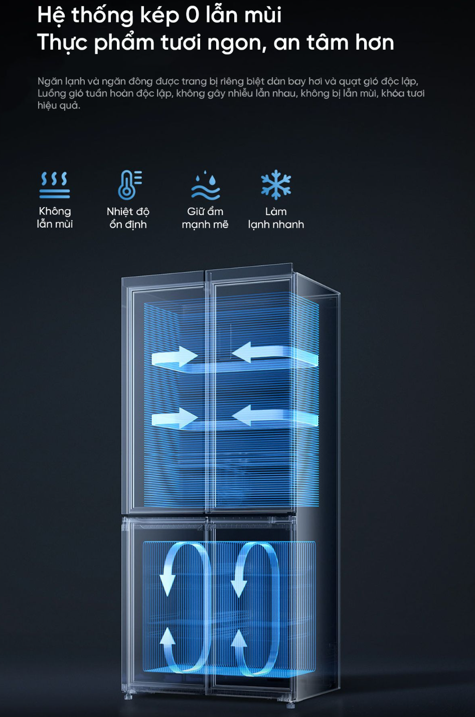 Tủ lạnh Mijia 513L Pro với công nghệ Pro Dual – Chu kỳ tuần hoàn kép không chuyển mùi. Mỗi ngăn có hệ thống làm lạnh và đông lạnh độc lập với thiết bị bay hơi và quạt riêng. Đường dẫn khí lưu thông riêng biệt, không giao thoa và ngăn chặn trao đổi mùi. Có thể khóa độ tươi của từng ngăn một cách độc lập và hiệu quả. Không chuyển mùi giữa ngăn mát và ngăn đông nhờ hệ thống tuần hoàn kép.