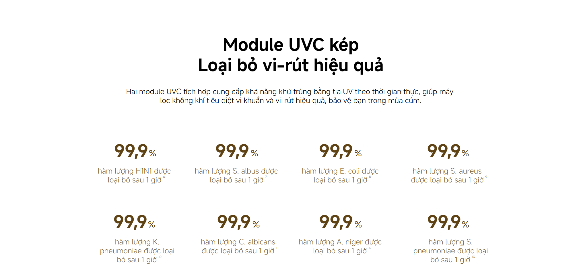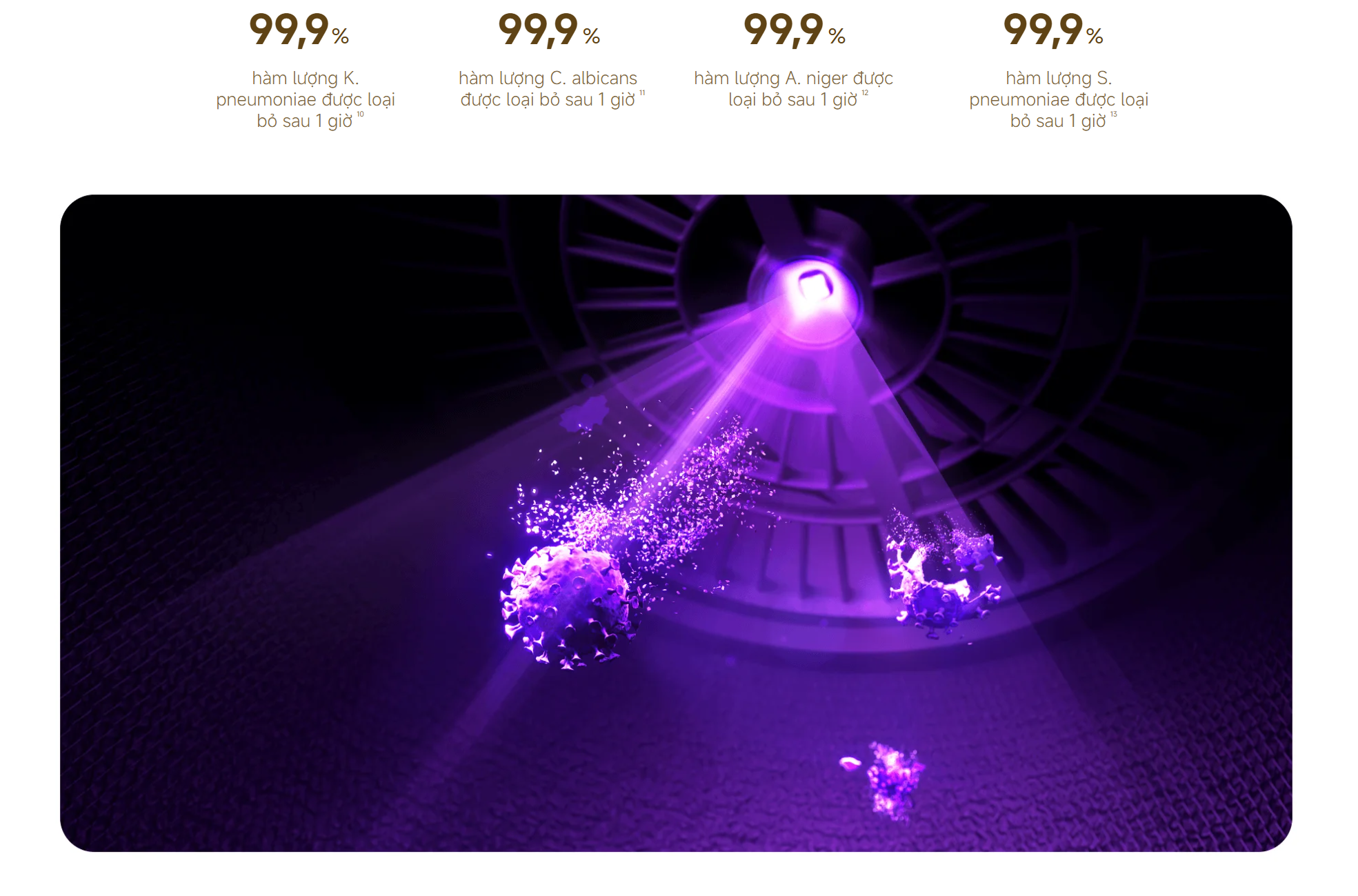 Loại bỏ vi khuẩn/vi sinh vật (H1N1/ Staphylococcus albus/ E. coli/ Staphylococcus aureus/ Klebsiella pneumoniae/ Candida albicans/ Aspergillus niger/ Streptococcus pneumoniae)