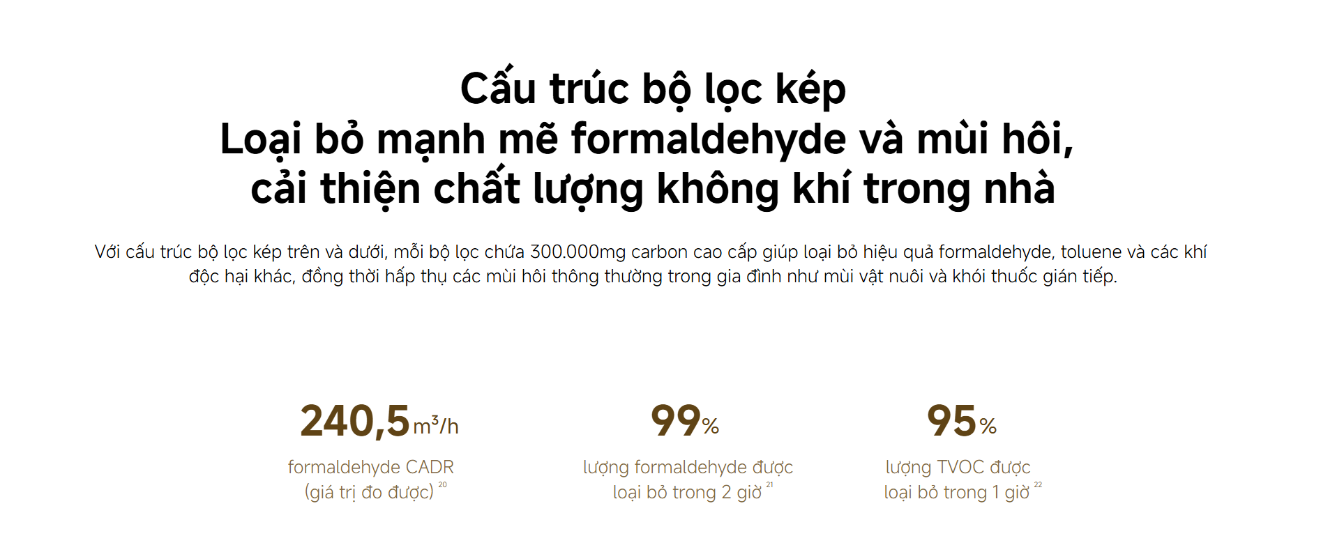 • CADR formaldehyde đạt 240,5 m³/h