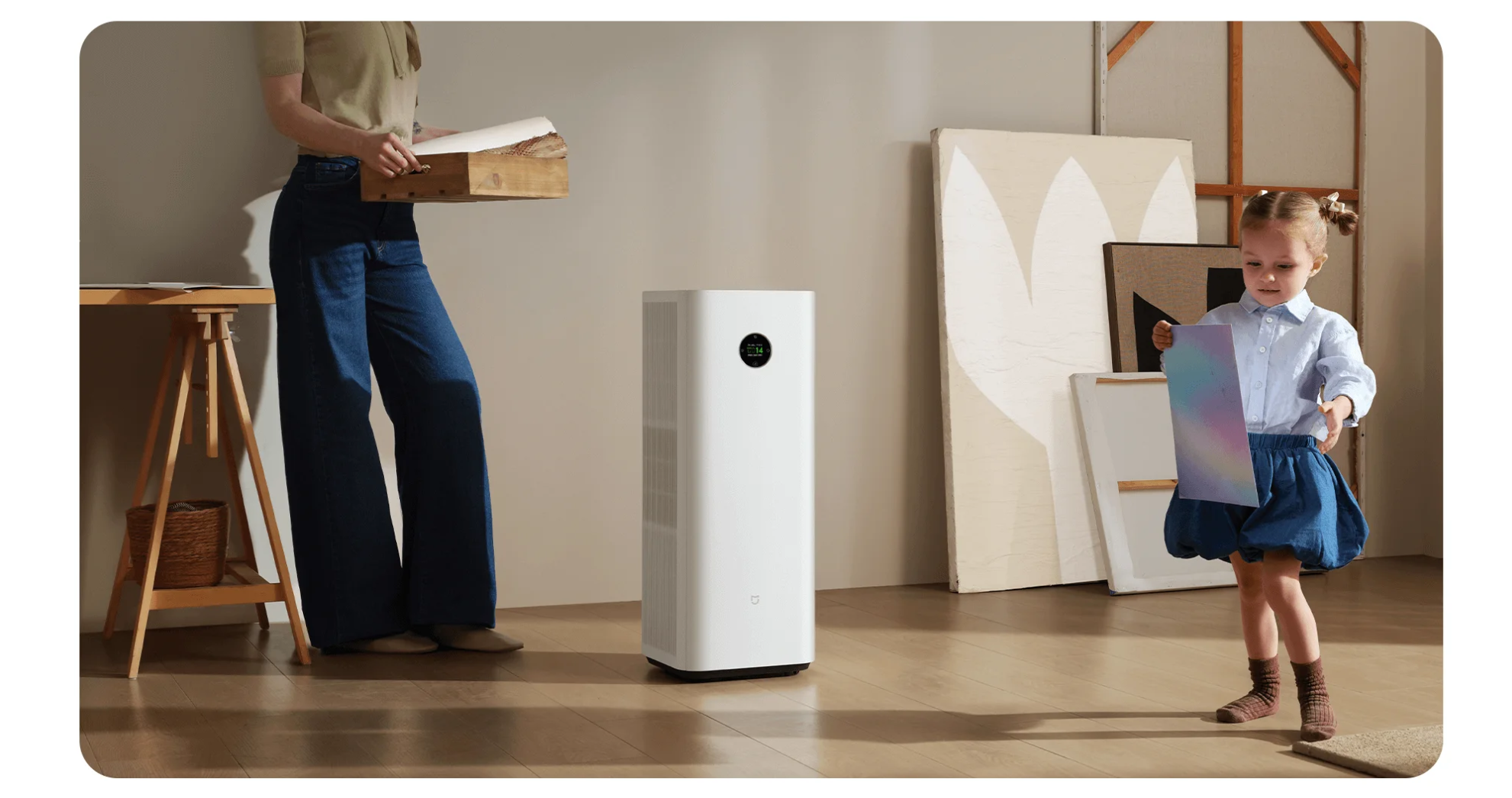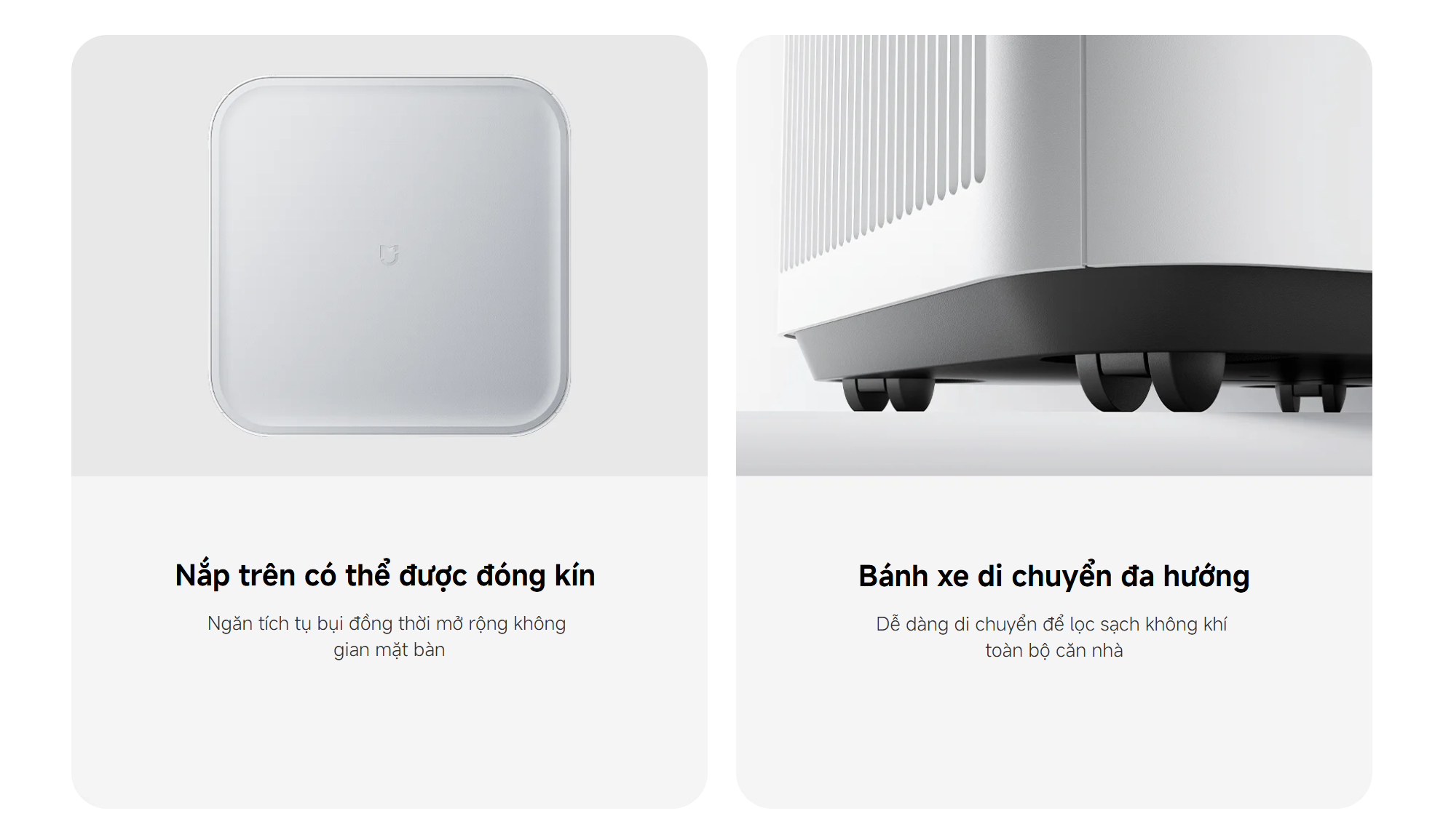 Sản phẩm sở hữu thiết kế mảnh mai, thanh lịch, tiết kiệm diện tích. Phần nắp trên đóng kín giúp hạn chế bụi bẩn và có thể tận dụng làm mặt bàn. Bánh xe đa hướng cho phép di chuyển linh hoạt giữa các phòng, dễ dàng lọc sạch không khí toàn bộ căn nhà.
